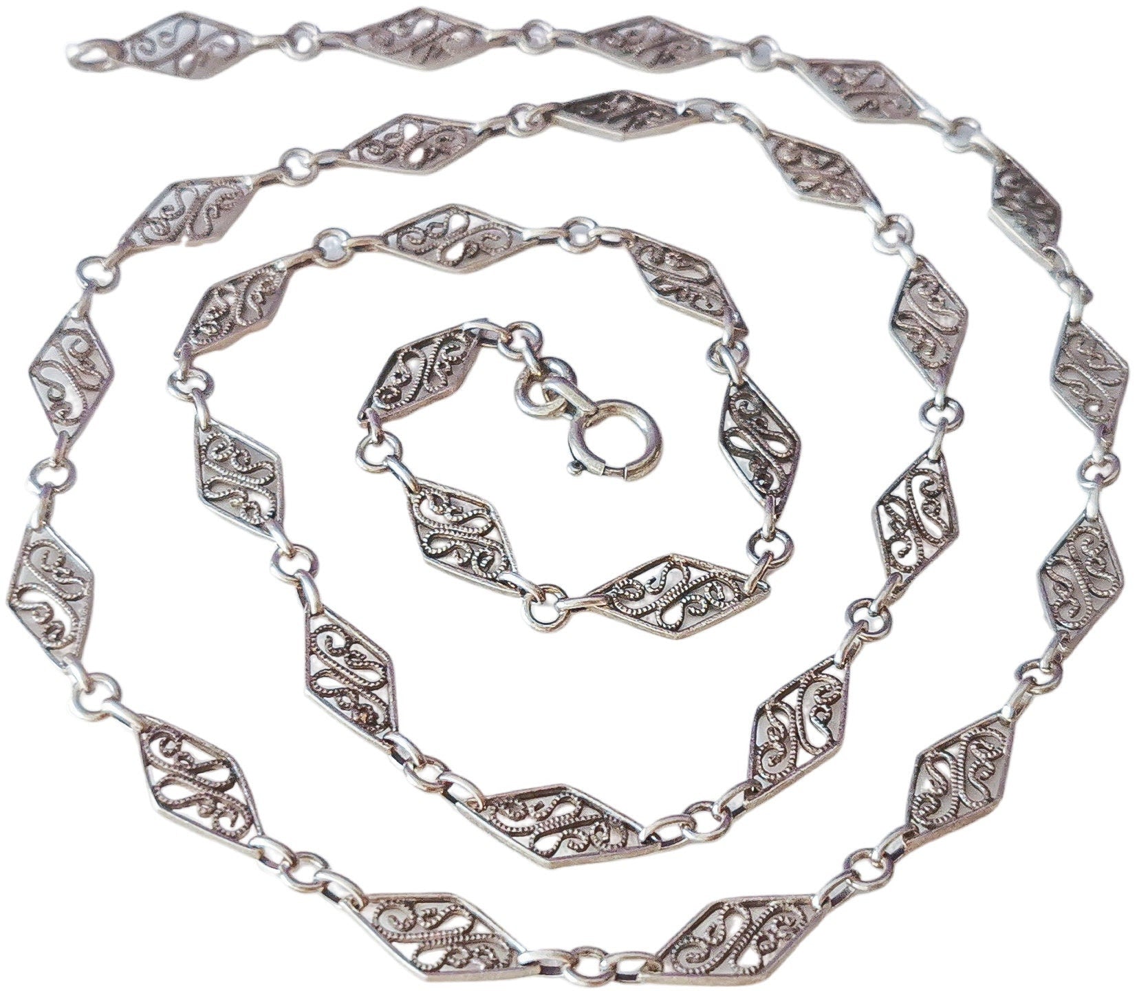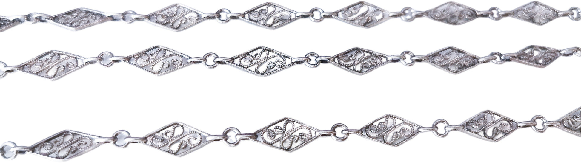 truly stunning French Edwardian chain, crafted with the utmost attention to detail and fashioned from high-quality silver. This exquisite piece boasts 30 lozenge navette links, each adorned with intricate filigree center detailing, beautifully connected by lengths of trace chain.