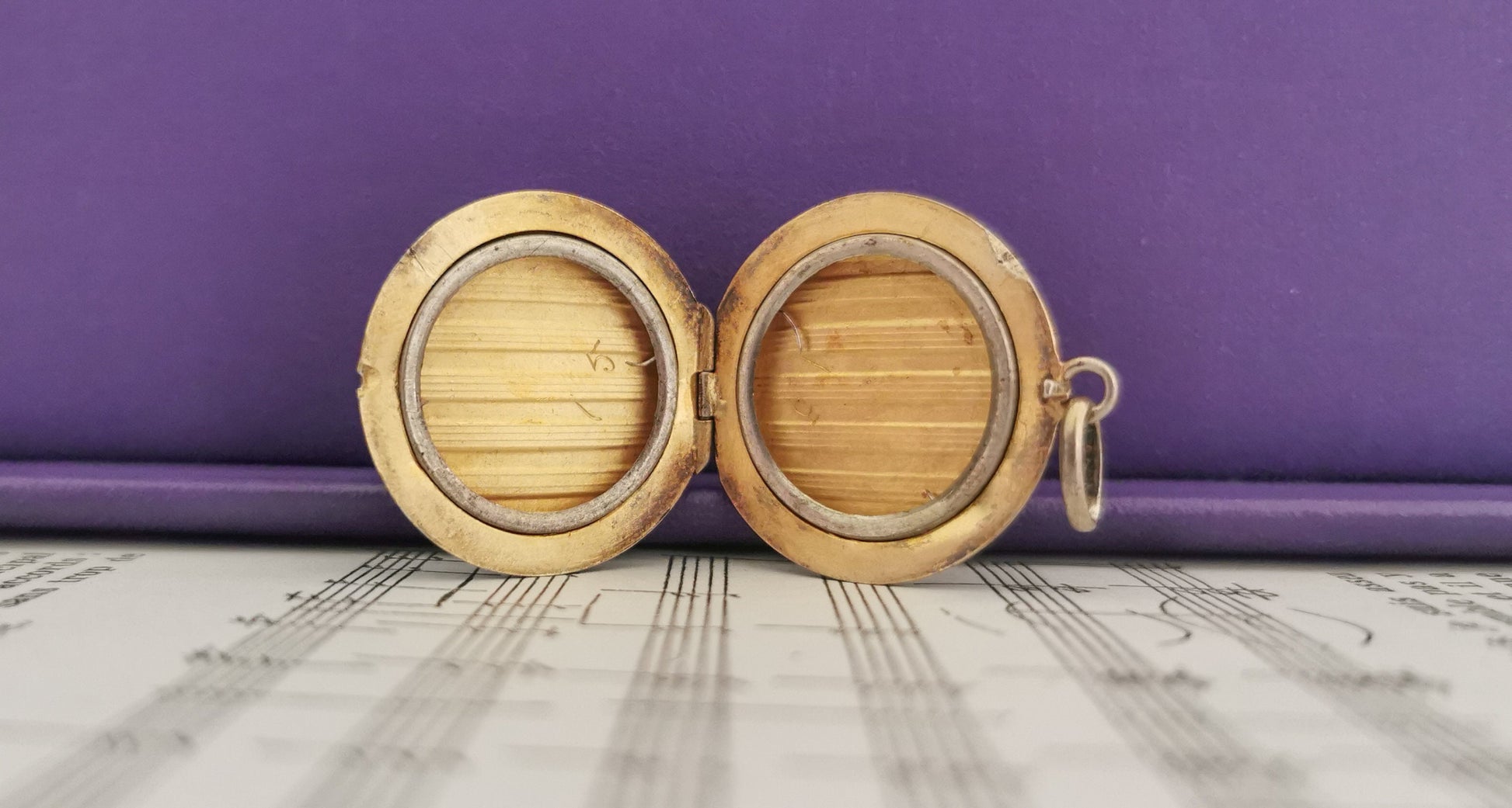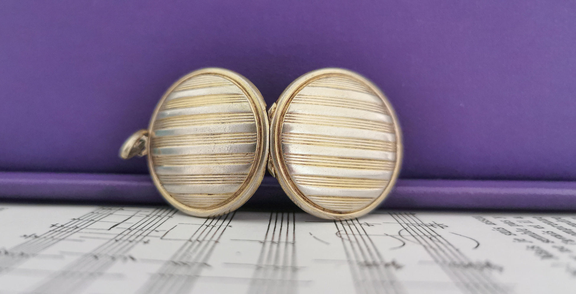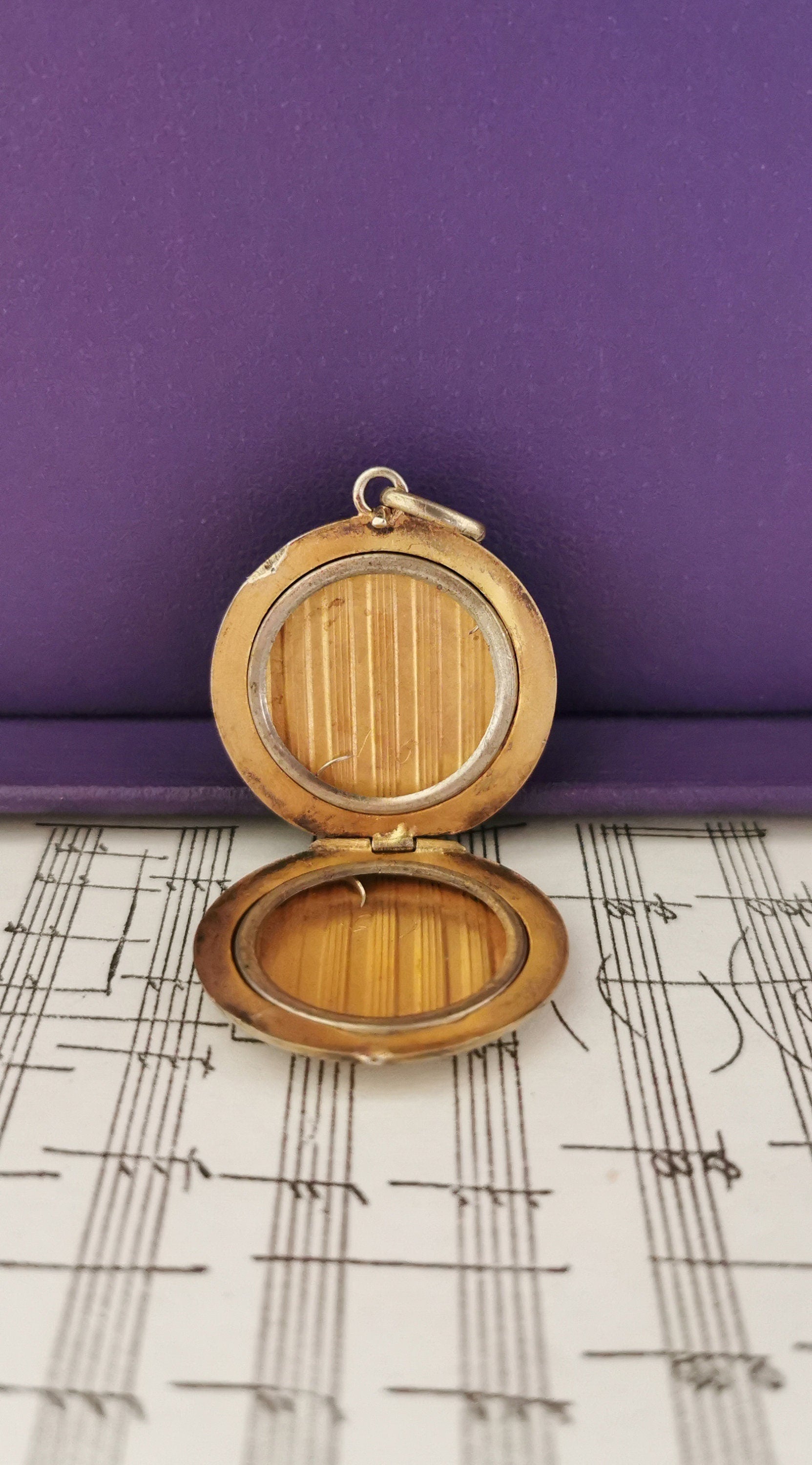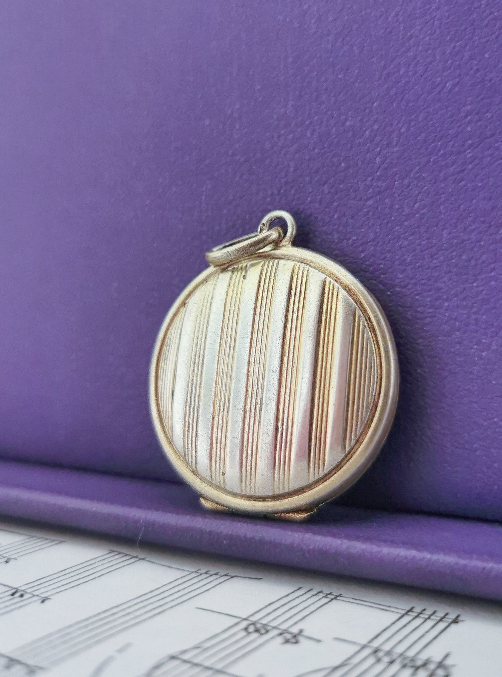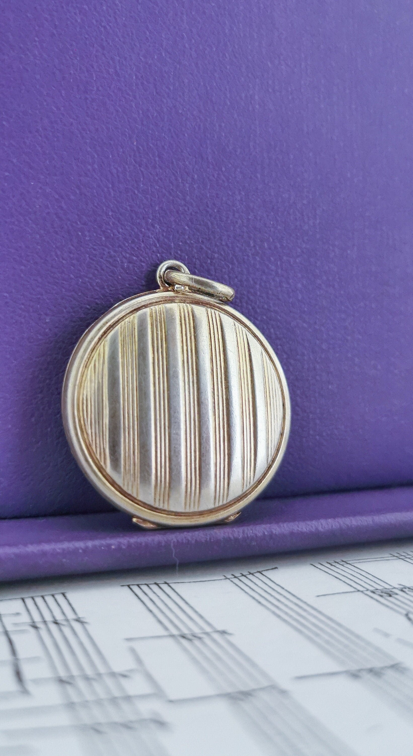 Beautiful round silver locket made of line pattern which opens from the top. Inside you can store a special memory and secure them within the 2 rings inside. You will fall in love with its gold wash interior called vermeil. This particular pendant has traveled through time . Light scratches consistent with age but nothing to take away of its beauty and some tarnish still remains that could be removed over time with gentle polish and silver bath. It closes well. From the early 1900s Edwardian period.
