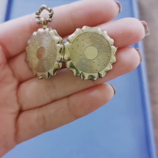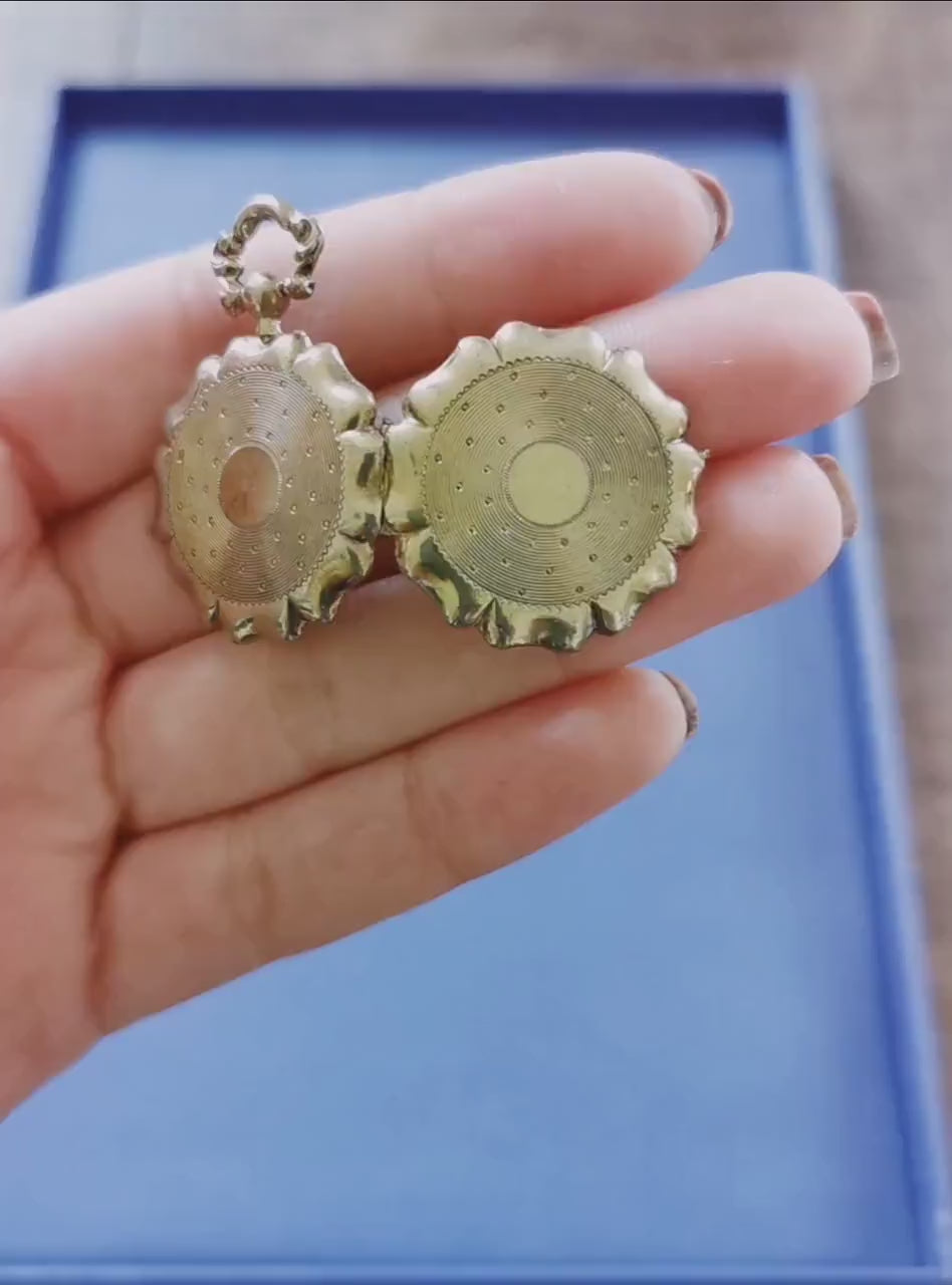 Breathtaking silver locket with engine waved designs. The front and the back feature the same designs. This lockets shape resemble a pocket watch and you will not be able to take your eyes away from it. i love its astonishing border shape. The interior is gold washed a technique called vermeil, bright, and shiny, yet is just another surprise to make your heart beat. We love the unique bail which resembles a pocket watch with a wave adornment. The locket itself is a piece of art. Excellent antique condition with light micro scratches consistent with age and some light tarnish that can be removed over time with gentle polish. Closes well and securely.