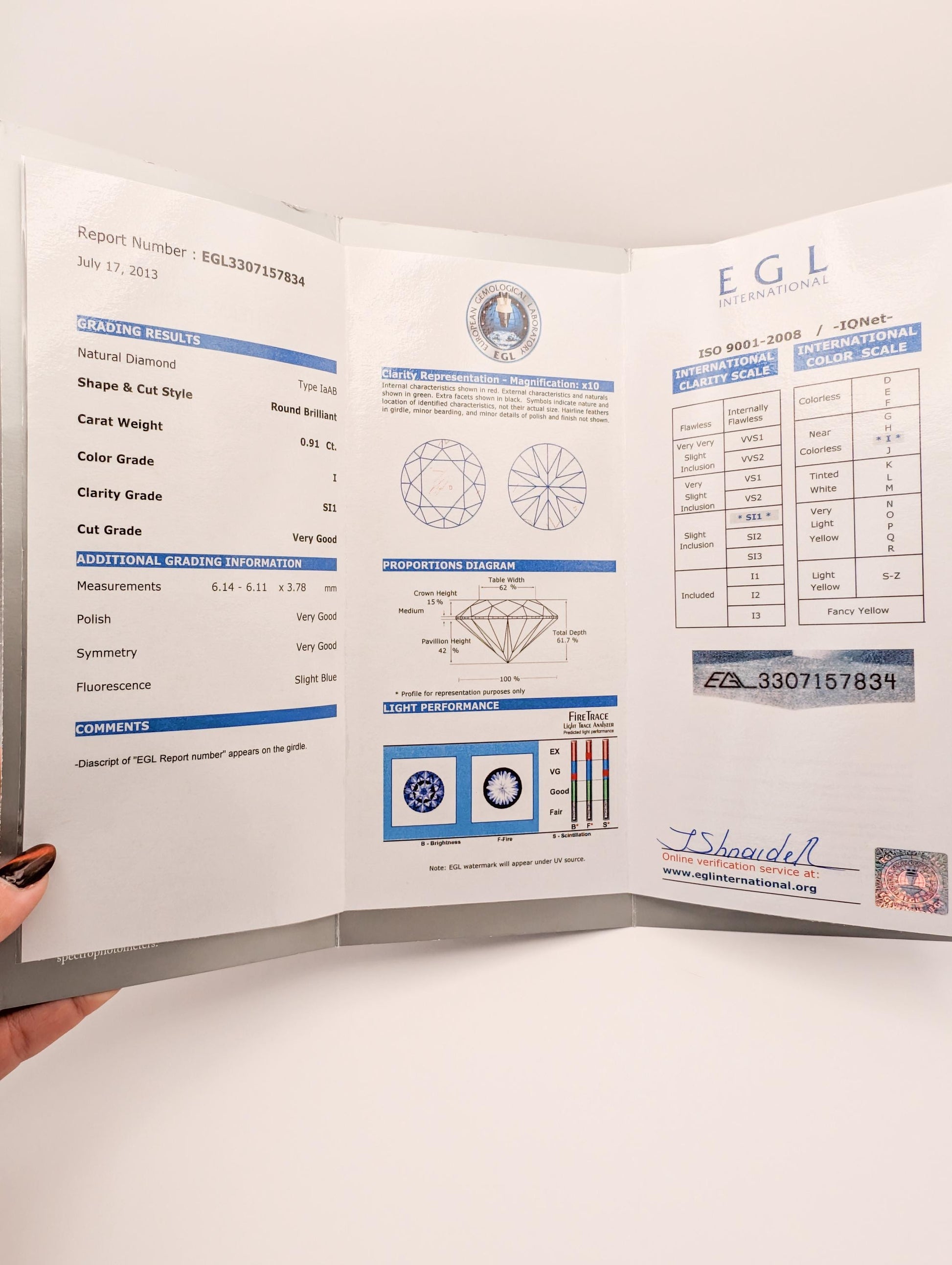 This exquisite vintage diamond ring from 2010 embodies elegance and luxury. Designed to celebrate life’s most meaningful moments, it features a certified 0.91-carat round brilliant diamond as its centerpiece. This diamond, with its I color and SI1 clarity, reflects light beautifully, making it an eye-catching symbol of sophistication and love.