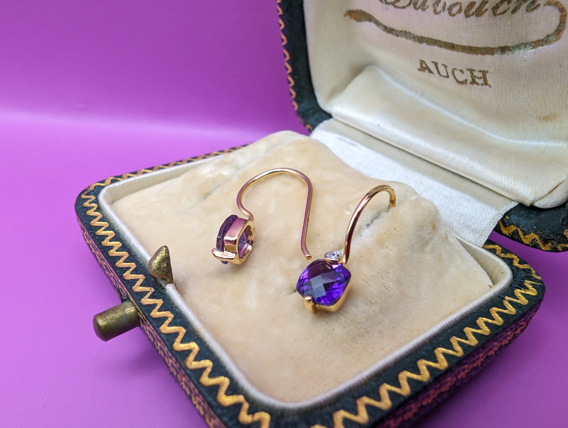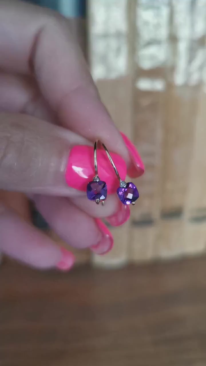 Gorgeous French Earrings holding a breathtaking natural amethyst with a faceted cut that makes it shine and reflect light, with a diamond on top.