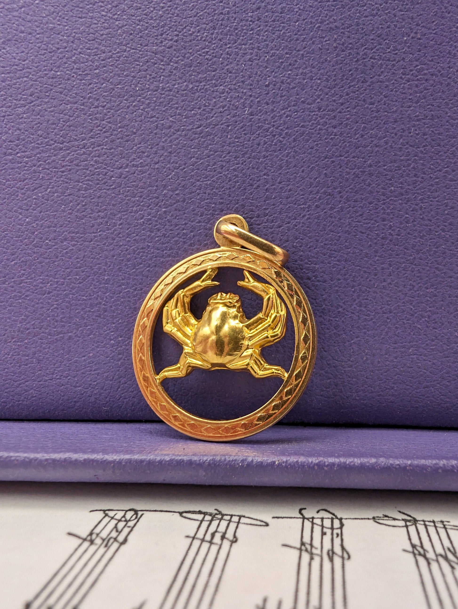 This unisex gold charm features a stunning crab motif, perfectly engraved and puffy, capturing the essence of the Cancer sign. The external circle of the pendant showcases a repeated pattern in relief, adding to its visual appeal and depth. In excellent vintage condition you couldn't dream of a more perfect jewelry. Light micro scratches to the gold consistent with age.