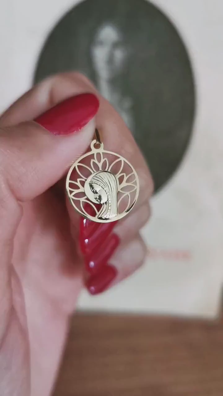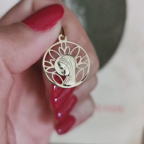 Crafted from high-quality 18K solid gold, this stunning French religious pendant features a profile depiction of the Virgin Mary facing left, delicately engraved within a circular pendant. The intricate engraving surrounding her adds depth and enhances the religious significance of the piece.