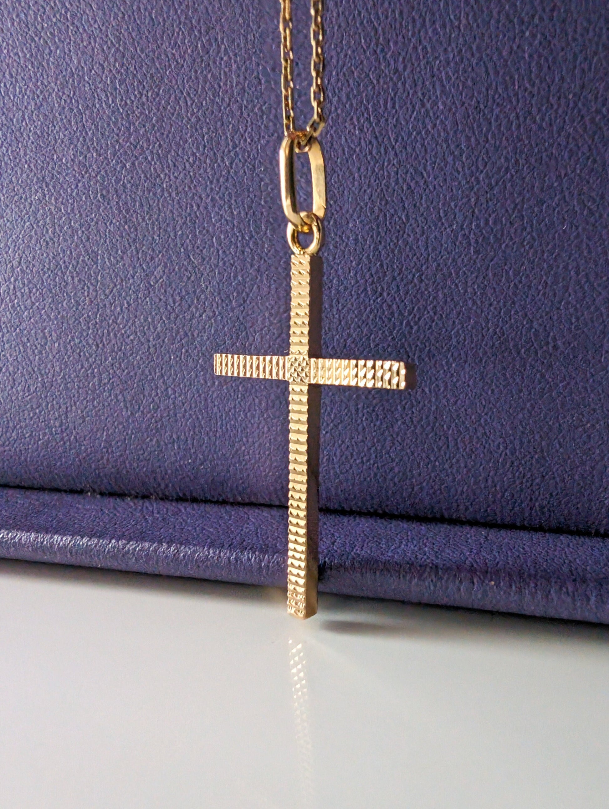 The exquisite craftsmanship of this cross is evident on each side, with delicate engravings adorning each side, creating a mesmerizing play of light.