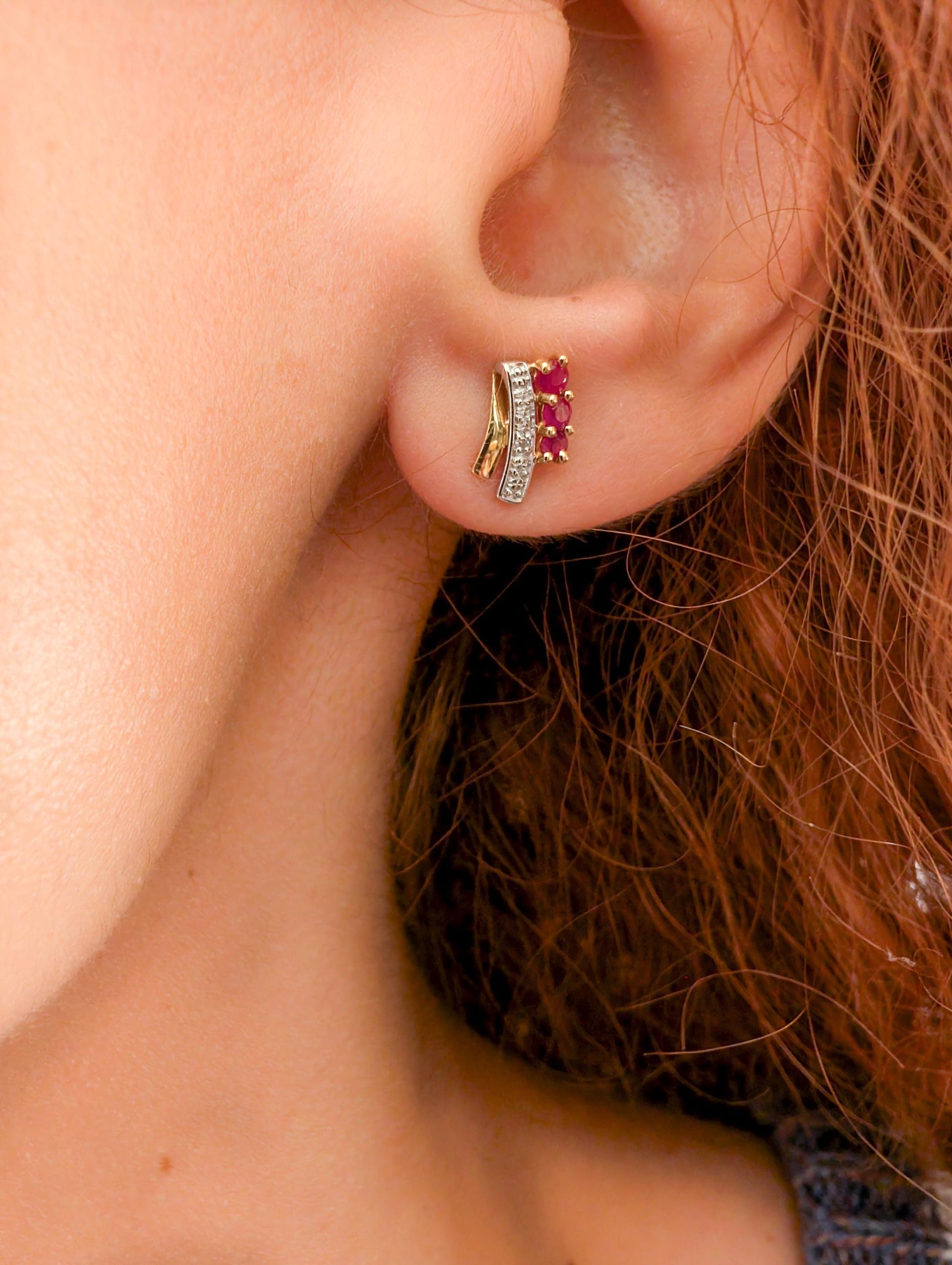 Stunning vintage earrings perfect for an everyday wear or a special occasion. Composed of 3 faceted rubies held by a yellow gold setting, it showcases 2 branvhes, one made of a faceted part with balls reflecting light like diamonds, and holding a 1mm diameter rose cut diamond, and another yellow gold branch.